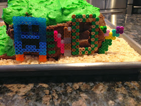 I found paper templates online for making your own minecraft creatures here. The first few kids who arrived saw the cake and were all pretty excited by it. I was surprised that they all wanted jello and rice krispy treats along with the cake and ice cream.